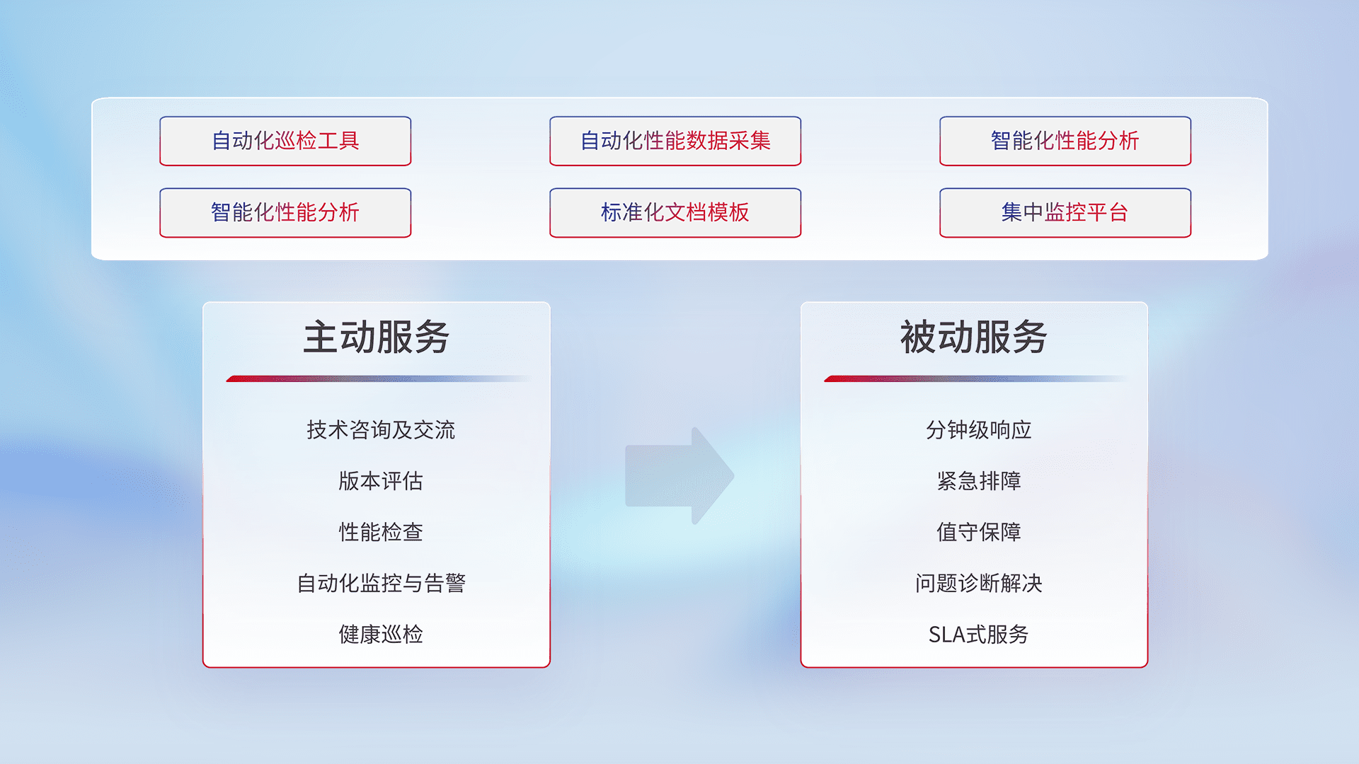 智能化工具和标准化文档,,,,保障服务质量,,提供主动服务(包含技术咨询、、、版本评估、、、、性能检查、、、、自动化监控与告警、、健康巡检)和被动服务包含(分钟级响应、、、、紧急排障、、值守保障、、问题诊断解决、、、SLA服务)。。。。